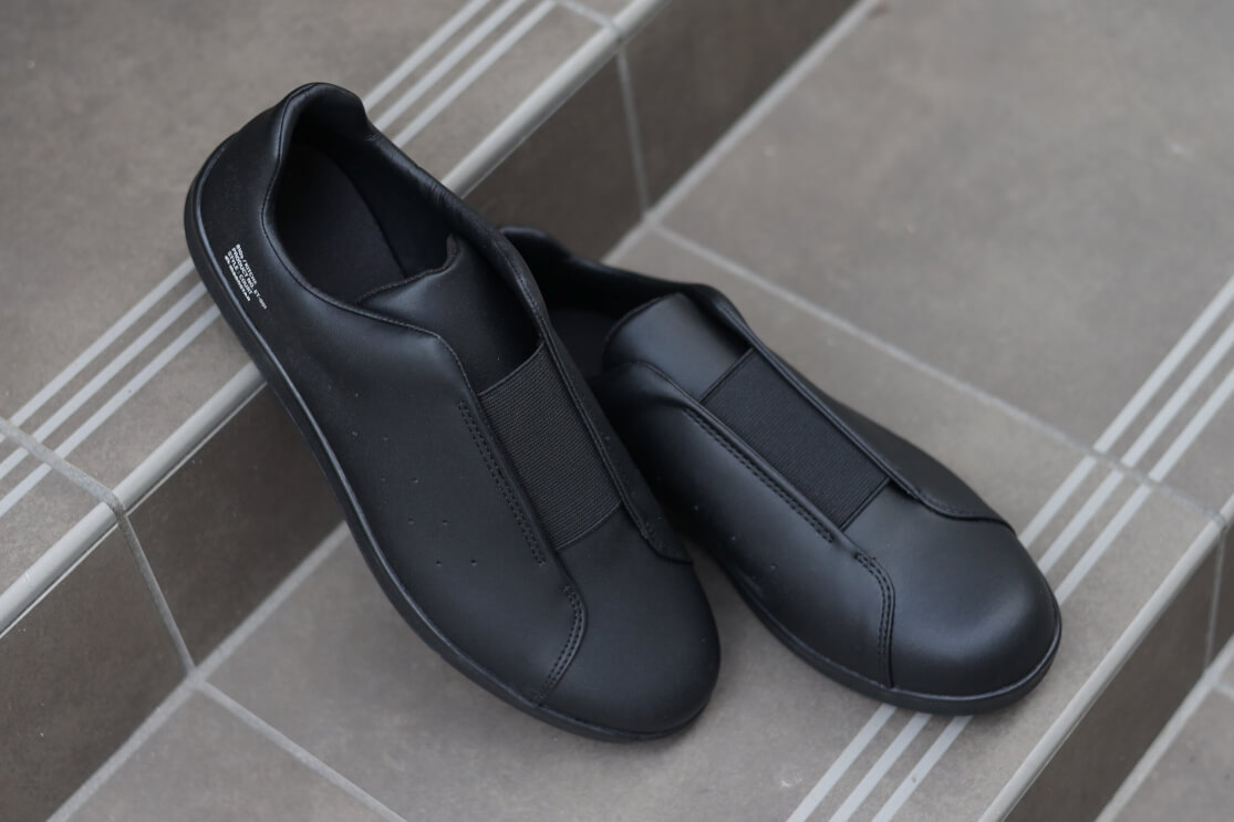デザインはソリッドなコート仕様。業務用の無骨さが削ぎ落とされて、ミニマルで優しい雰囲気に整えられています。横から見るとアディダスのスタンスミスを彷彿とさせますが、それよりもさらにシンプル。素材の切り返しが少ないので、まるで革靴のような上品なイメージがあります。