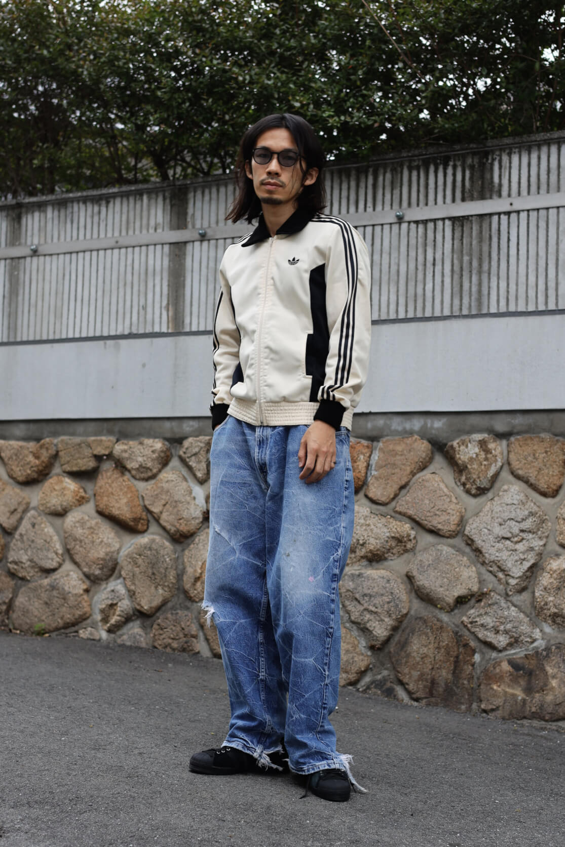 白のタイトなトラックジャケットに、ブルーのバギーシルエットのダメージデニムを合わせたコーディネート。足元は黒のスーパースターで引き締めています。