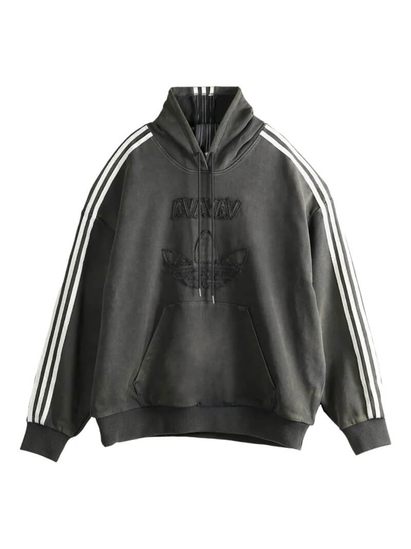 アディダスのクラシカルなジャージやスウェットに、バレンシアガらしいビッグシルエットを組み合わせたアイテムは、スポーツウェアというよりもアート作品に近い存在感。さらに、アディダスのトレフォイルロゴとバレンシアガのロゴが重なり合うデザインは、両ブランドの共演を視覚的に強烈に印象づけています。