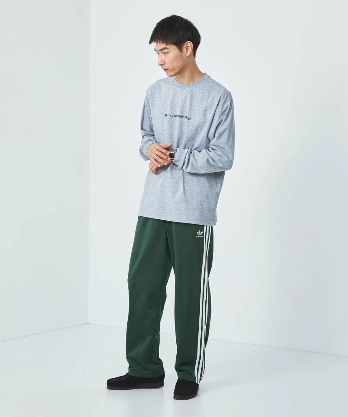 ファイヤーバードのグリーンのトラックパンツは、カジュアルかつスポーティなアイテム。これにシンプルなロンTを合わせることで、ラフでリラックス感のあるスタイルが完成します。足元にはクラークスの靴を合わせることで、程よくトラディショナルな要素が加わり、シンプルながらも個性的なコーディネートになります。トラックパンツの特徴的な3本ラインが、シンプルなコーデにアクセントを加えてくれます。
