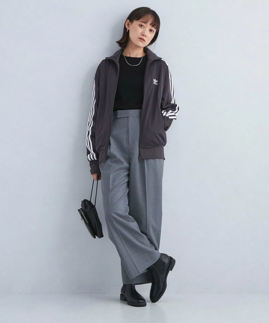 カジュアルなTシャツとスラックスの組み合わせに、ファイヤーバードのトラックジャケットを羽織ることで、スポーティでありながらもクリーンなコーディネートが完成します。スラックスのきちんと感と、トラックジャケットのカジュアルさが絶妙に調和し、程よく力の抜けたスタイルに。足元にはサイドゴアブーツを合わせることで、都会的で洗練された印象を与えています。