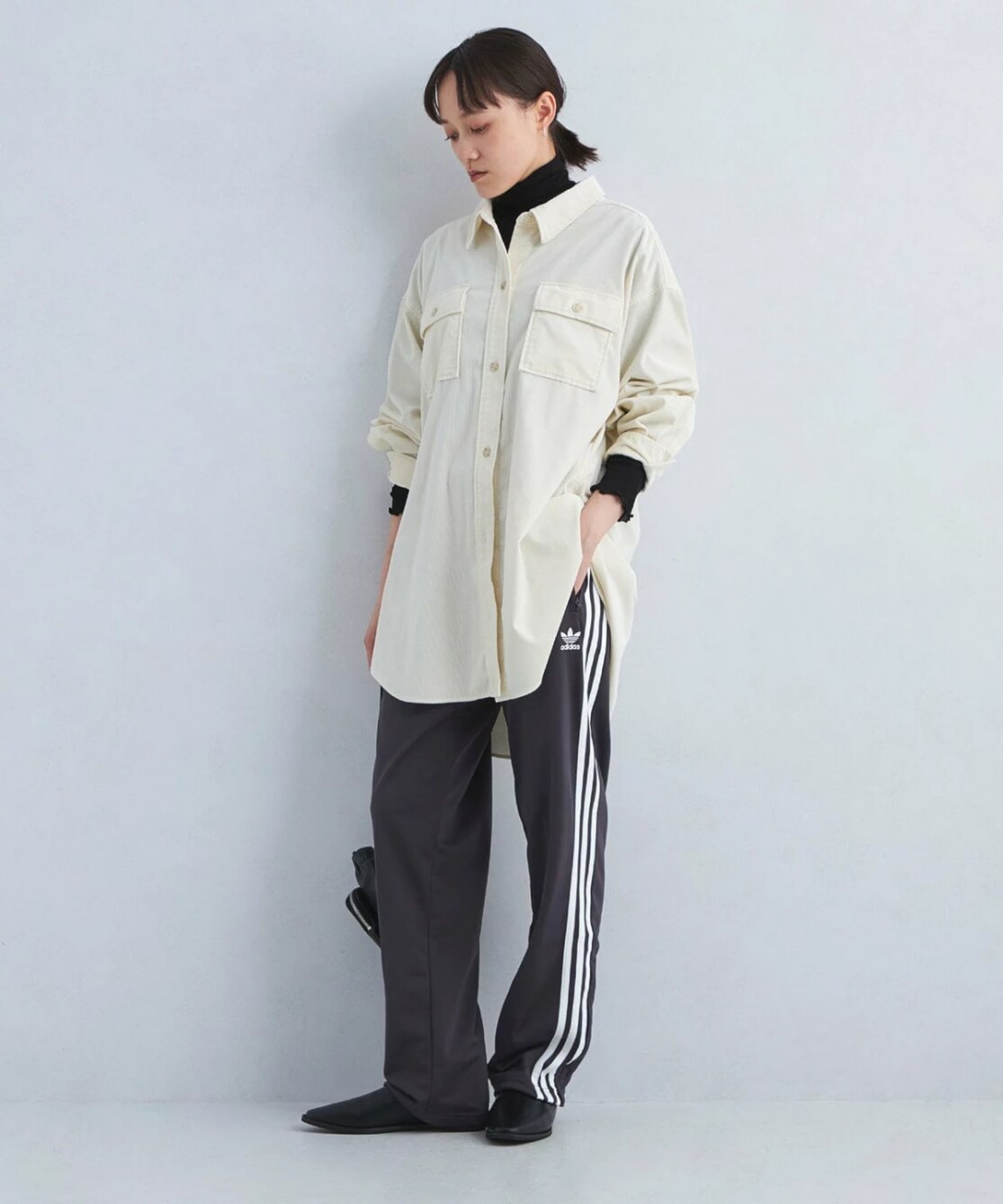トラックパンツ×シャツ×タートルネック