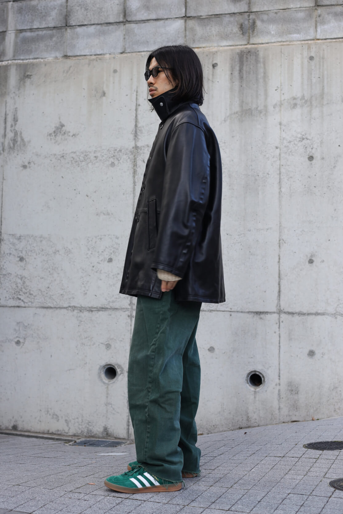 黒のレザーコートに、ボトムスをグリーンでまとめた、メリハリのある冬のコーディネート。上半身のレザーが、カジュアルなボトムスを引き締めます。ガゼルインドアのスポーティさがアクセントに。