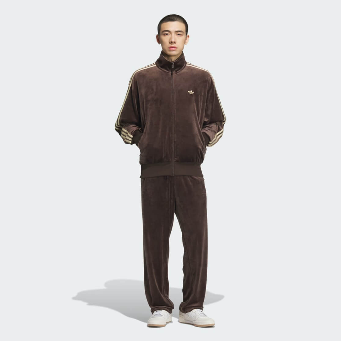光沢のあるジャージ素材は、軽やかで着心地がいいだけでなく、ほんのり漂う高級感も魅力。上下にあしらわれたスリーストライプスとトレフォイルロゴは、まさにアディダスのDNAを象徴するディテールです。