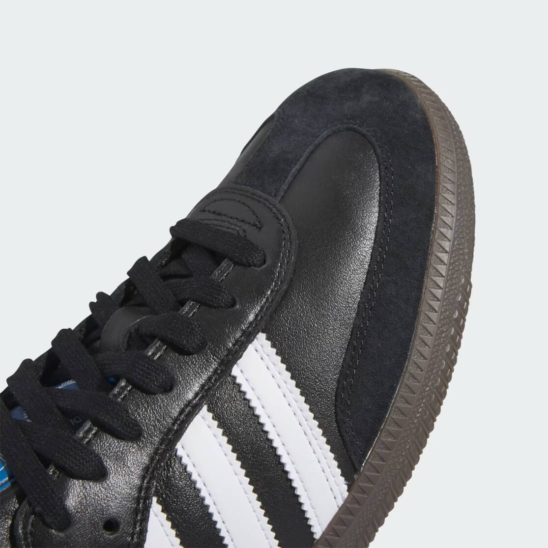 最大の違いはつま先。OGは一枚革のT字トゥなのに対して、ADVは二重構造になっており、さらに「アディタフ」という強化素材で補強。スケートボードのデッキで擦れる部分を守るための設計で、通常のサンバよりも圧倒的に長持ちする仕様です。