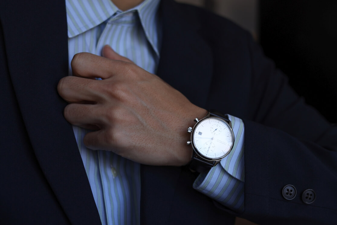 今回僕が選んだのは、ホワイトダイヤル。白は無彩色で、色彩理論的にも他の色を邪魔しません。スーツのネイビー、シャツの白、デニムのインディゴ。どれに合わせても、時計だけが浮くことはありません。