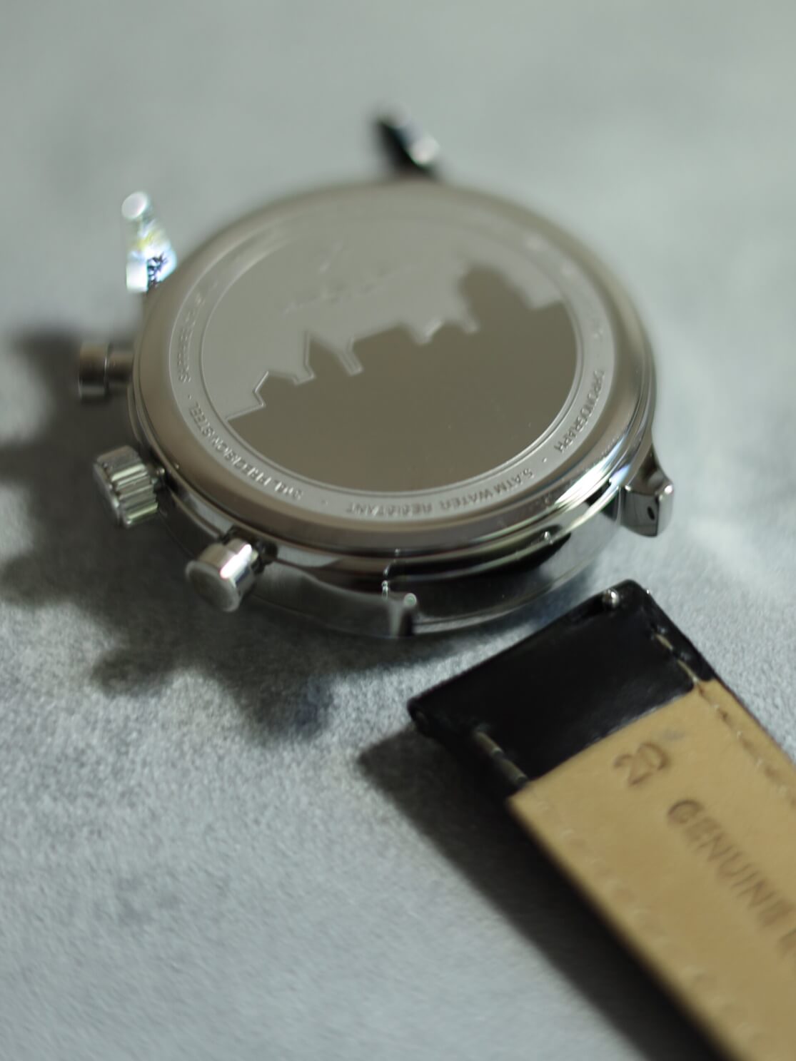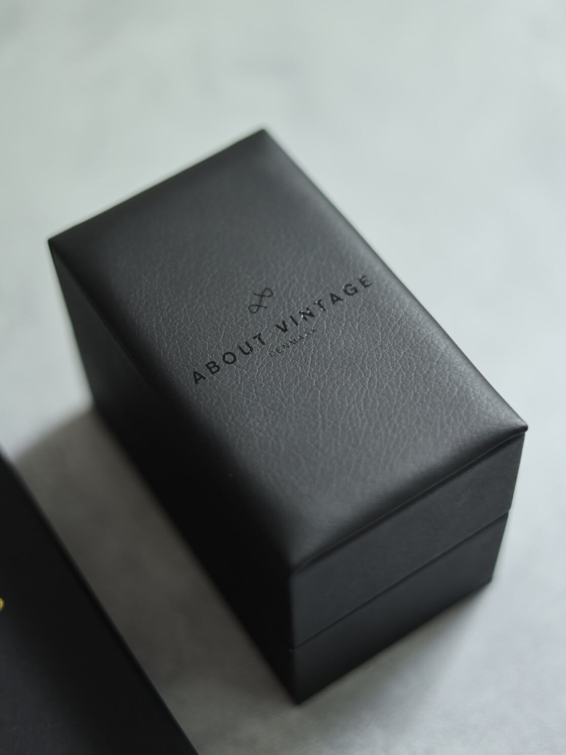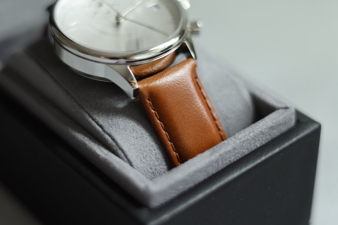 時計は、ロゴ入りの合成レザーボックスに収納されています。指先で触れると、しっとりとした質感と控えめな弾力。安価な合皮にありがちな軽さやチープさはありません。