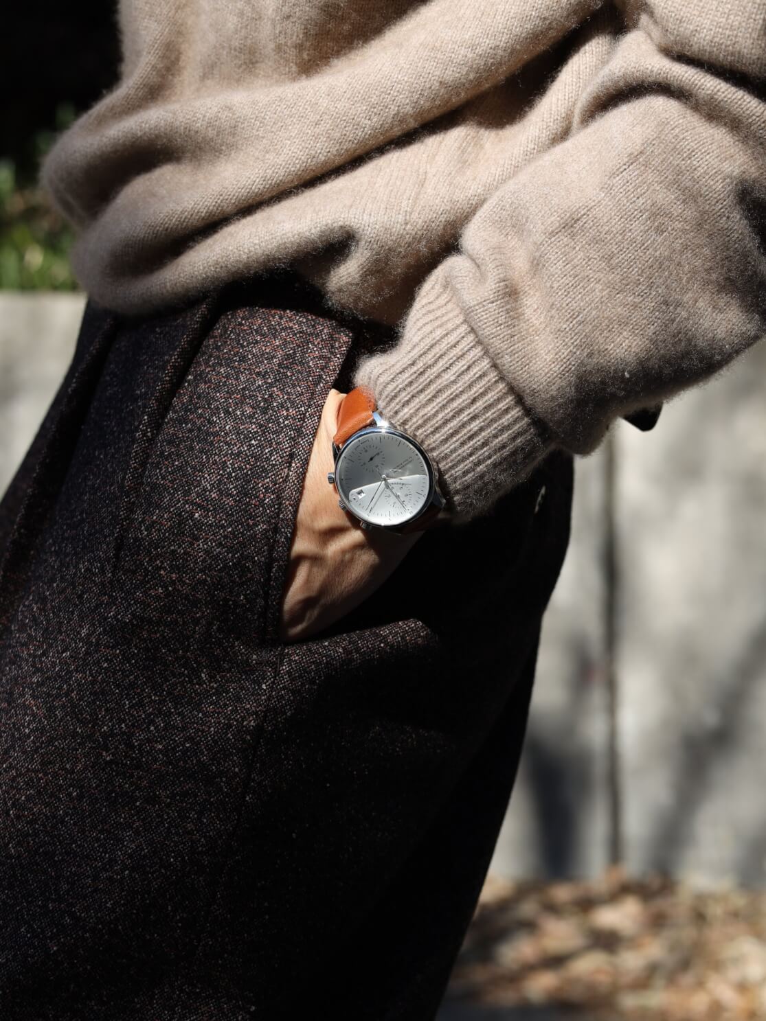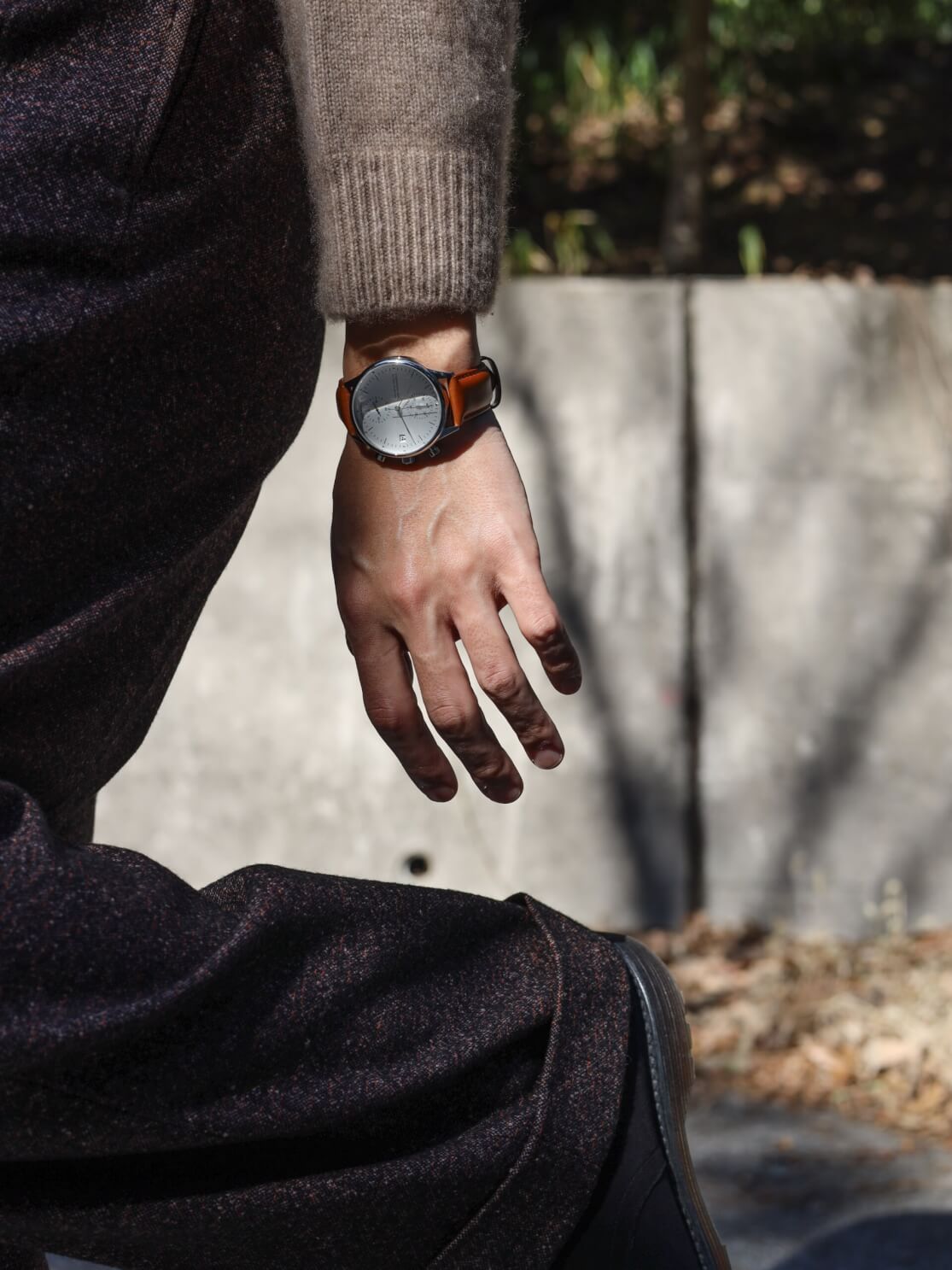 ブラウンは、ネイビー・ブラック・グレーといった定番のビジネスカラーと相性がよく、1844の白文字盤と組み合わせることで、全体を知的で落ち着いた印象にまとめてくれます。