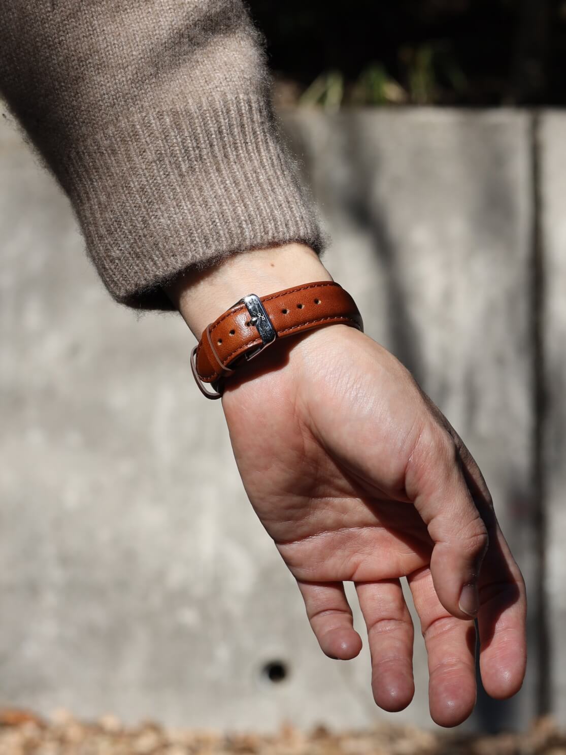 新品状態ではやや硬さがありますが、これはマイナスではありません。日常的に使うことで徐々に柔らかくなり、手首に吸い付くように馴染んでいきます。