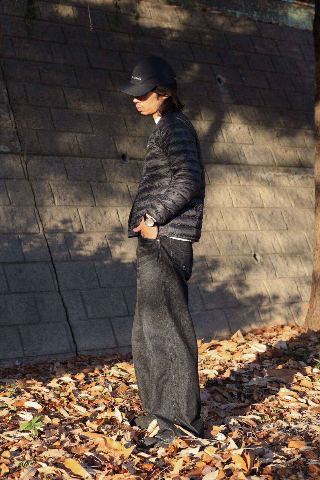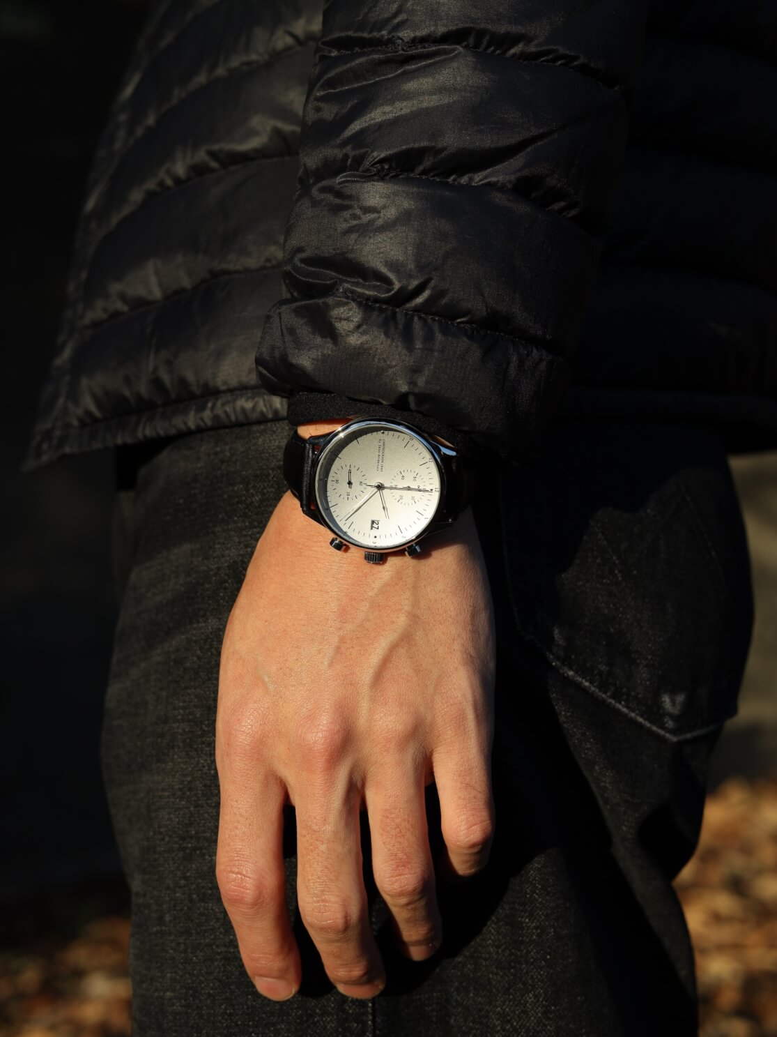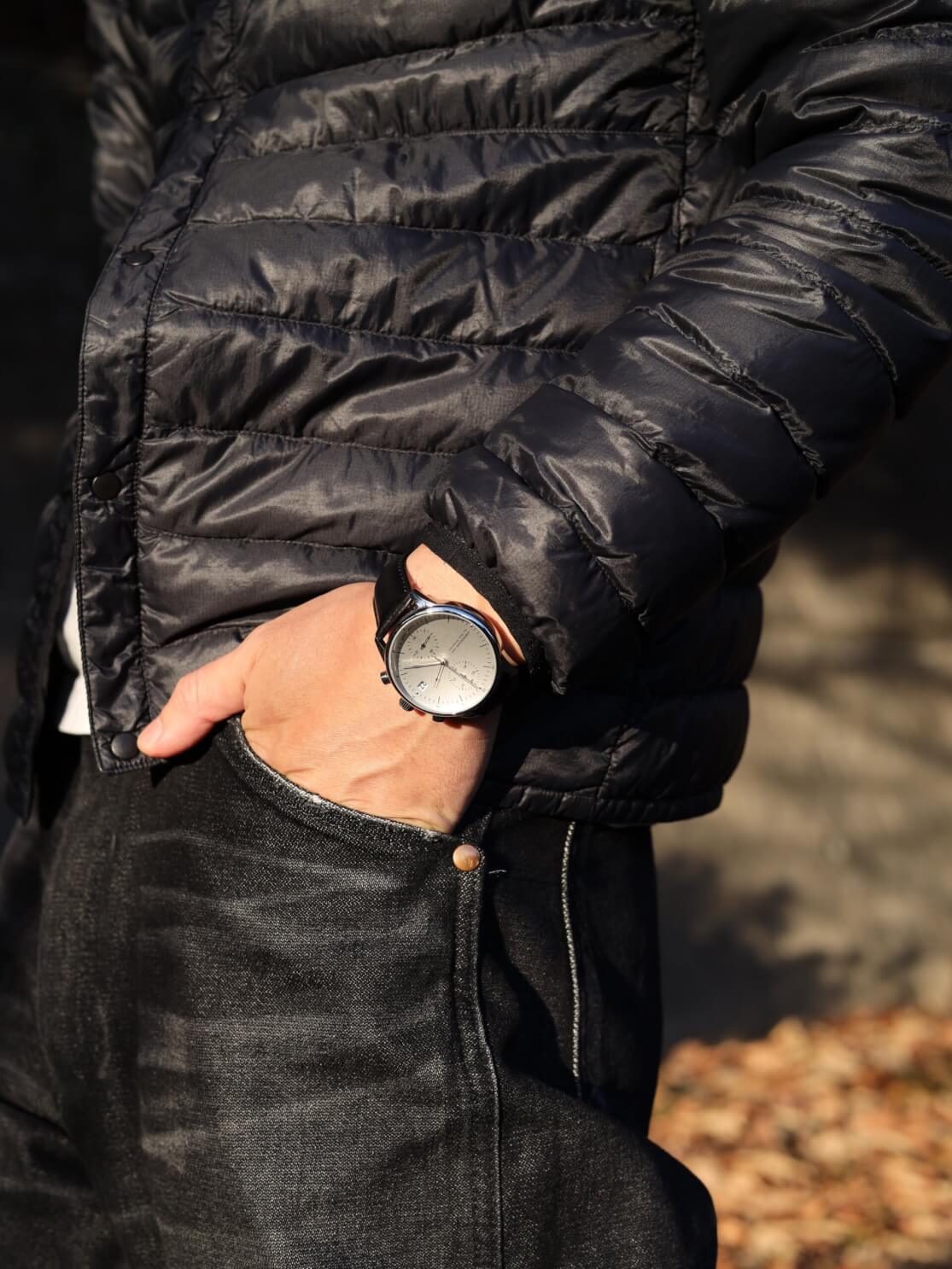 次に、ブラックレザーを使ったプライベートスタイル。黒のインナーダウンにデニムという、かなりラフなコーディネートでも、1844を着けるだけで、手元に品格が生まれます。