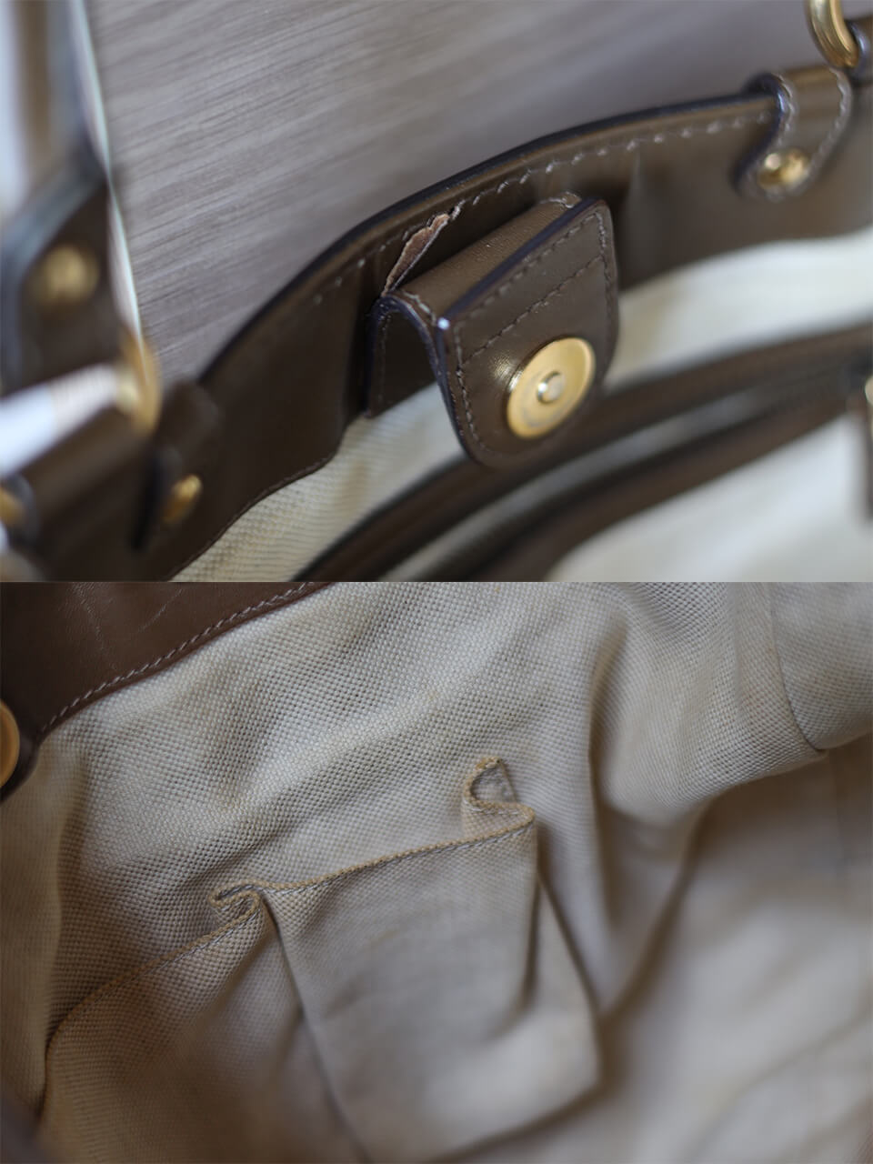 マグネットボタン付け根に剥がれ。内側布地に全体的な汚れ。