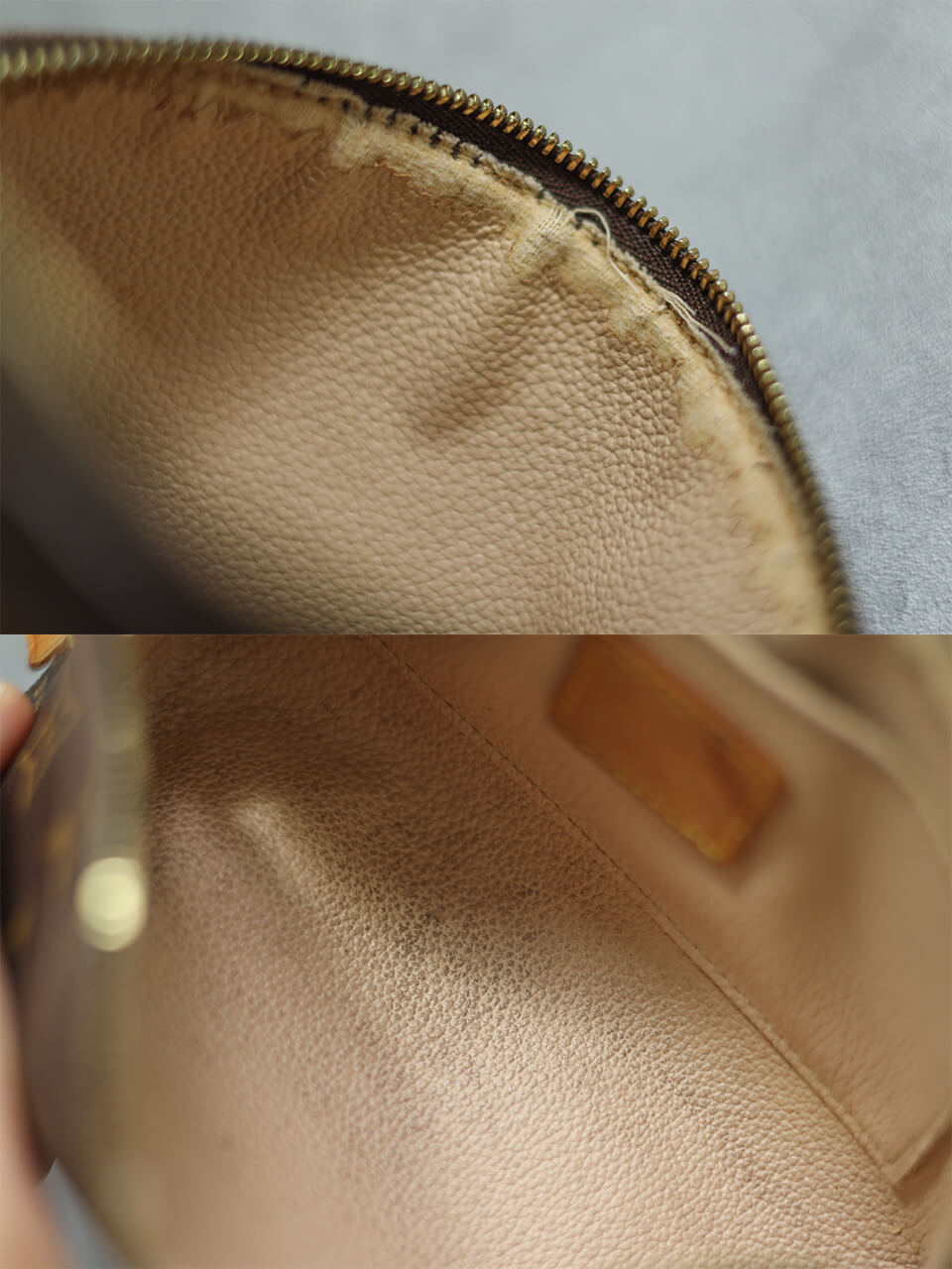 ストラップ不足。コバ剥げ。型崩れ。金具に細かい傷。持ち手レザーほつれ。