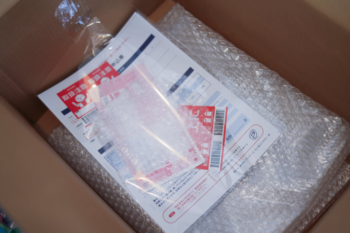 中には「買取申込書・伝票・緩衝材・取扱注意シール」が入っています。