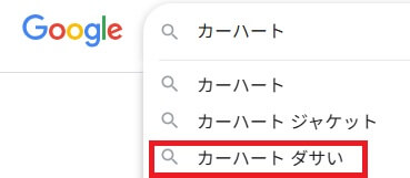 「カーハート」と検索すると、予測ワードの上位に「カーハート ダサい」と出てきます。これは「一部の人が悪く言っている」という話ではなく、多くの人が「そう見えてしまう理由が分からず、不安になっている」証拠です。