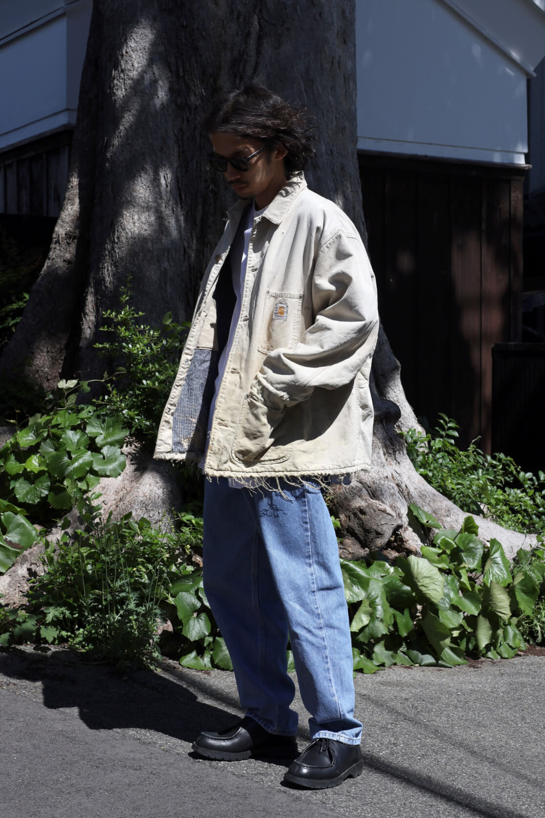 80年代の白いチョアコート。しかも、かなり退廃的なボロ感が出た一着です。白を活かし、明るいブルーのワイドテーパードデニムを合わせて春らしさを表現。白×ライトブルーの色合わせは、ワーク由来の無骨さを中和しつつ、季節感も自然に演出できます。
