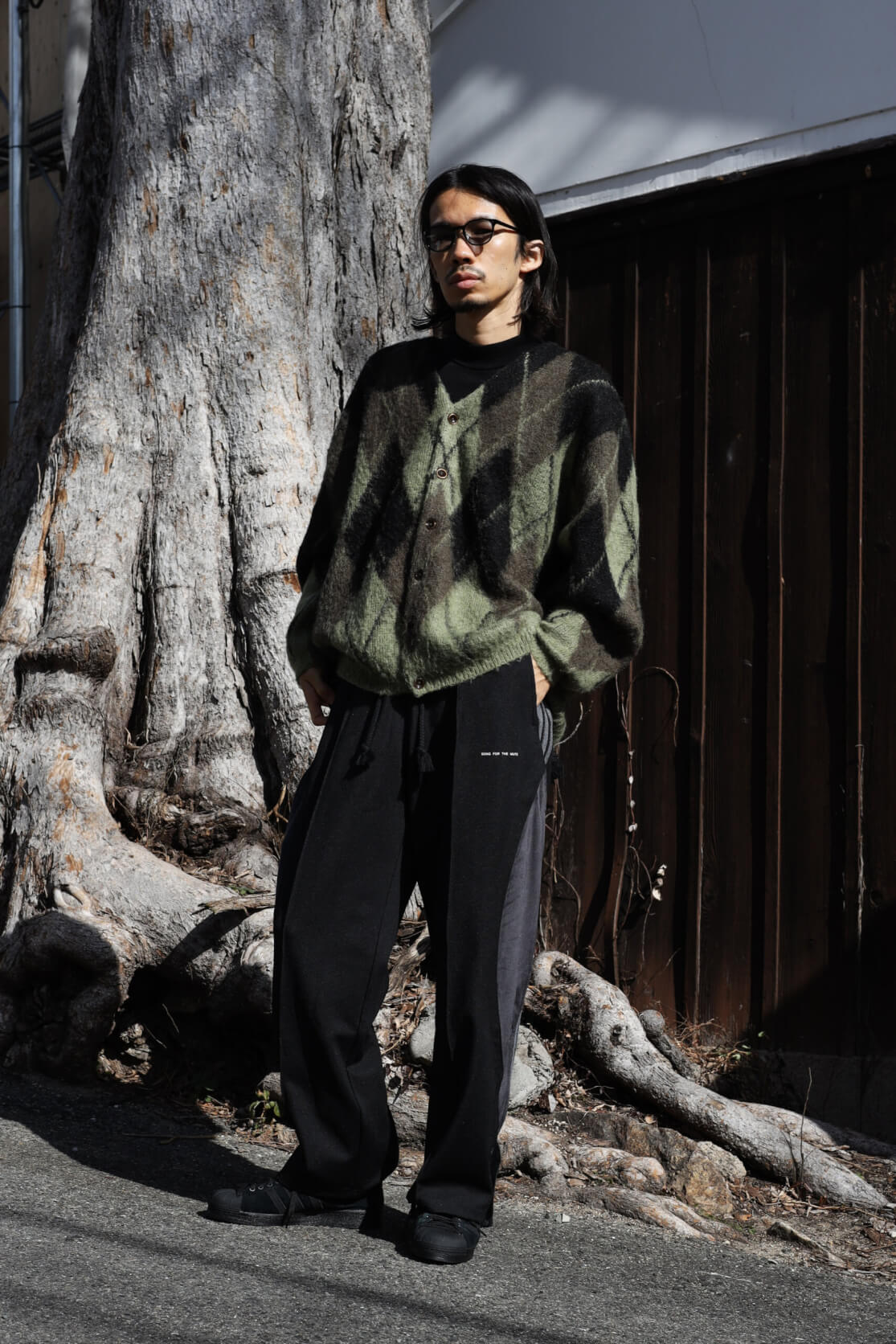黒×グリーンのアーガイルVネックカーディガンに黒のモックネック。上半身だけを見ると、かなりトラッドです。そこへ、黒のアディダスのトラックパンツとスニーカーを投入。スポーティで直線的なサイドラインが、ニットの柔らかさと対比をつくります。