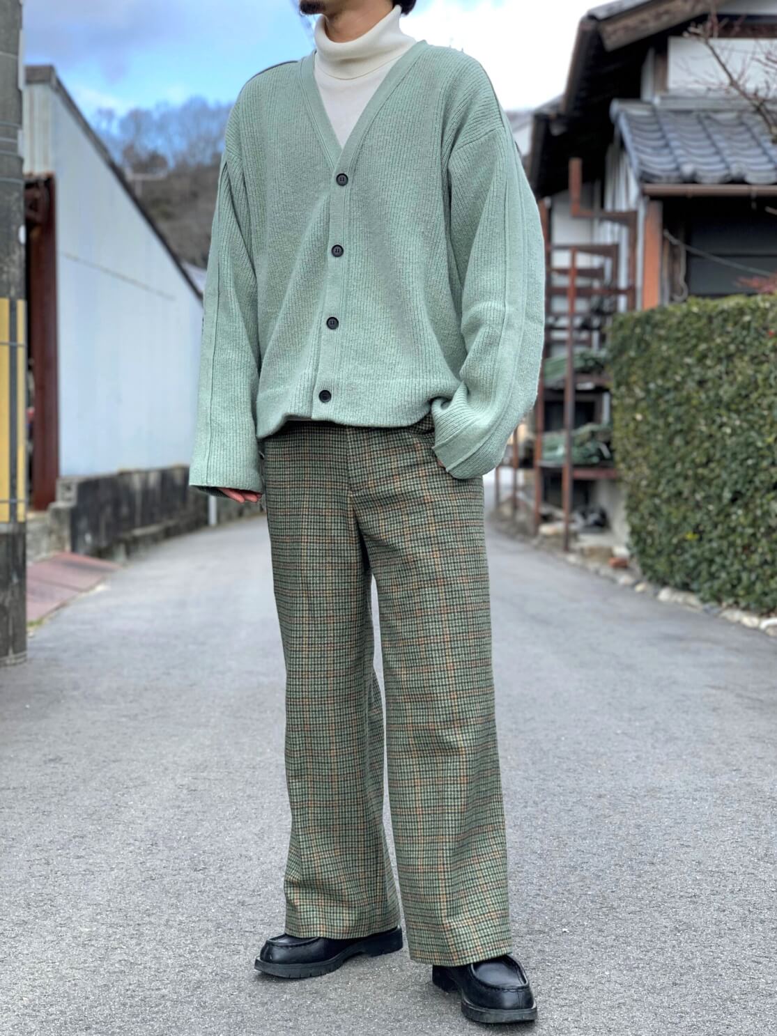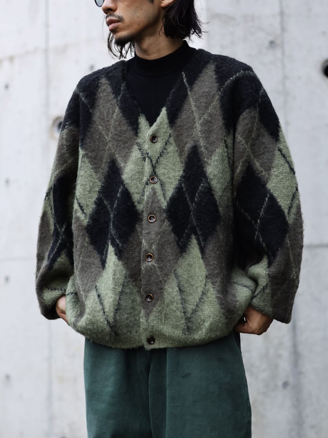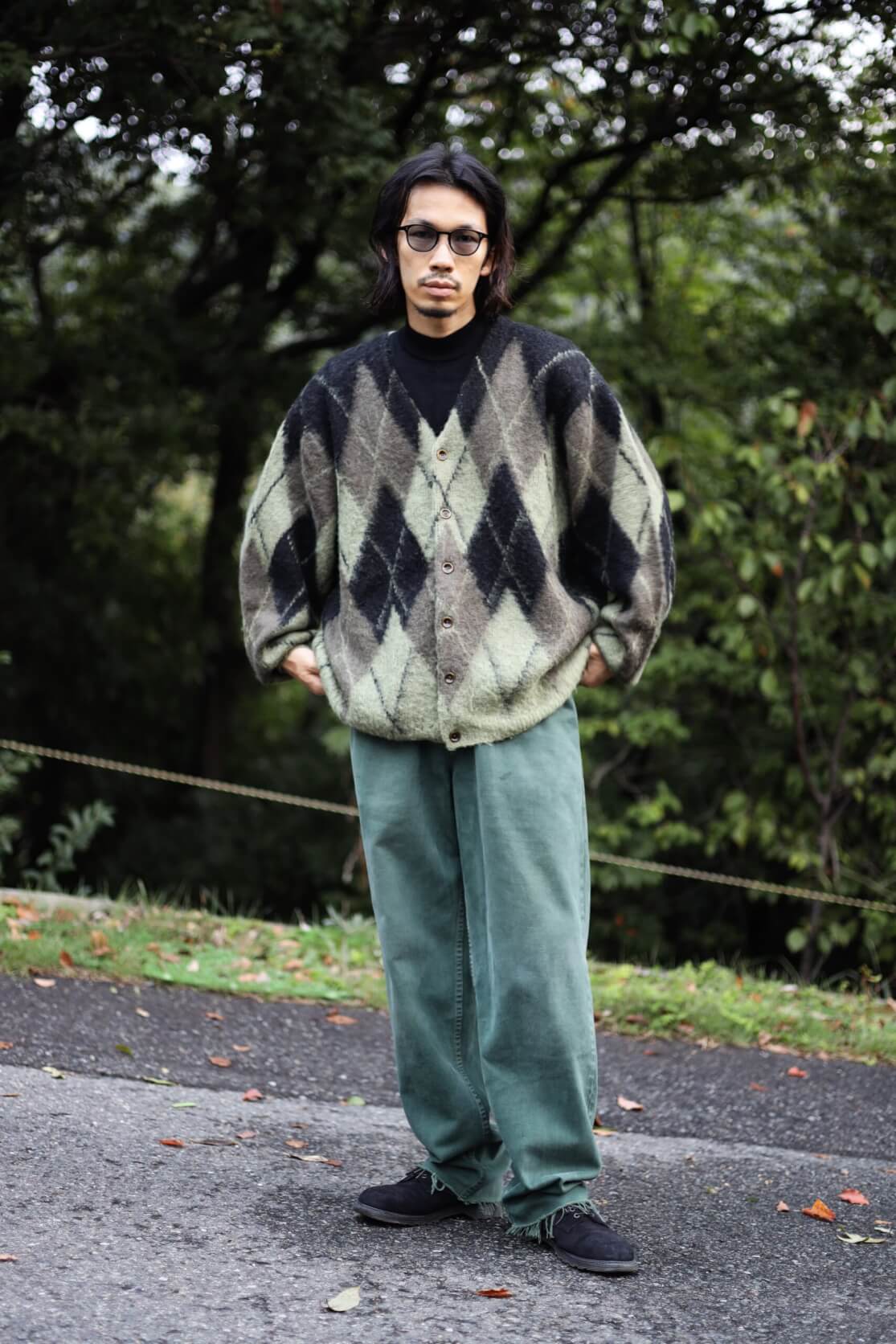 黒×グリーンのアーガイルのVネックカーディガンに、同系グリーンの古着ワイドデニム。ここで大事なのは「色数を増やさない」こと。全体を黒とグリーンの2色に限定します。