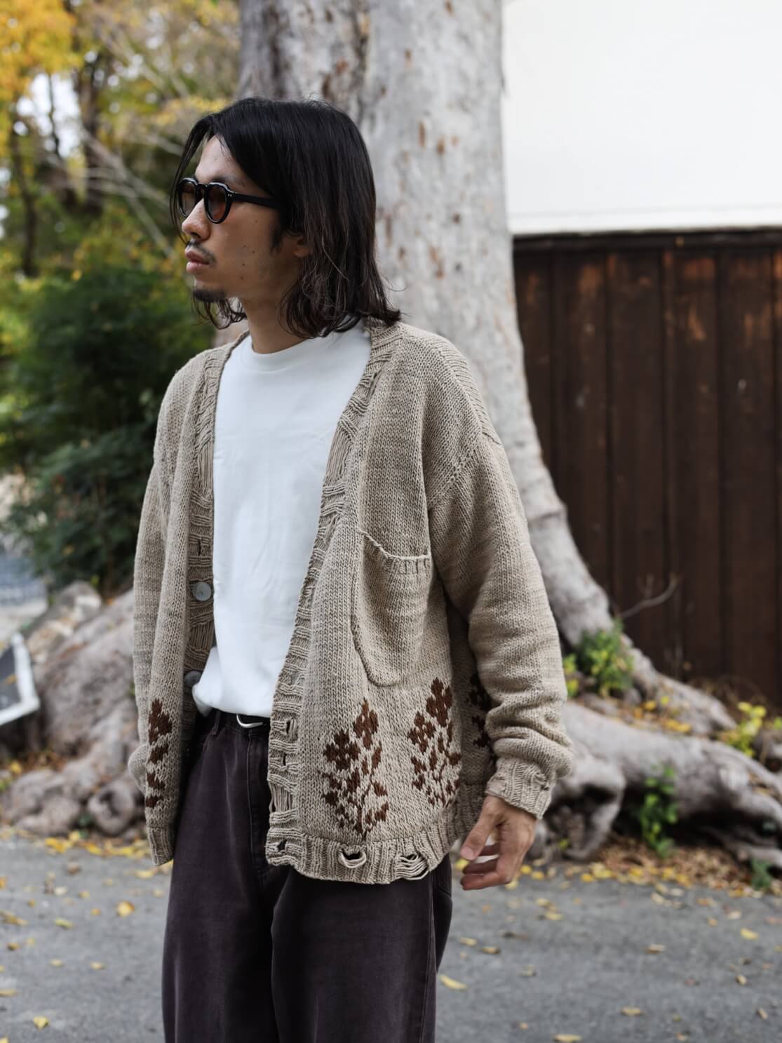 ヴィンテージ加工のベージュ×ブラウン柄カーディガンを主役に、柄のブラウンをボトムスで回収。ダークブラウンのワイドデニムが、上半身のにじんだ古着感を静かに受け止めます。インナーは白T。ここに白を入れることで、全体が軽くなります。