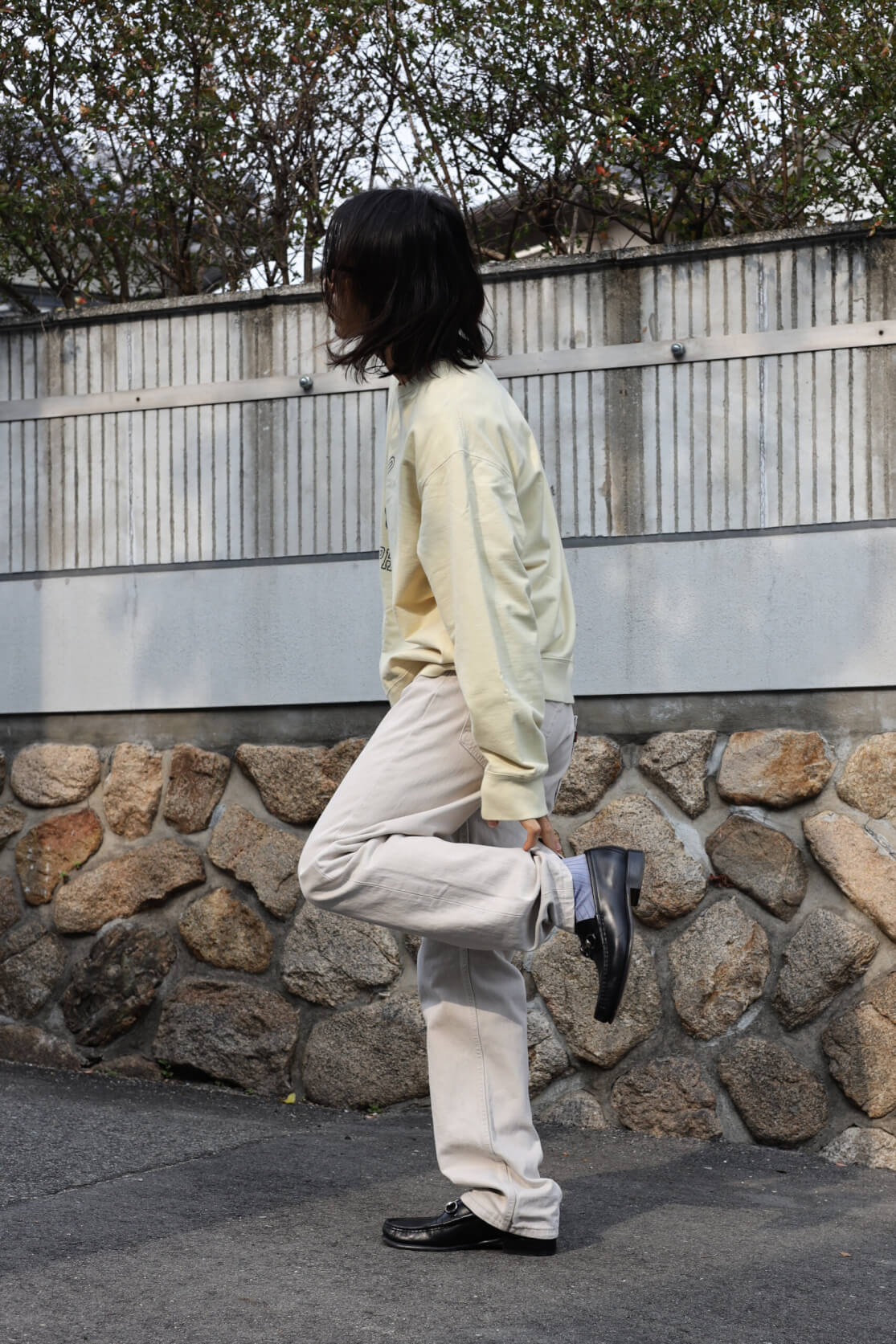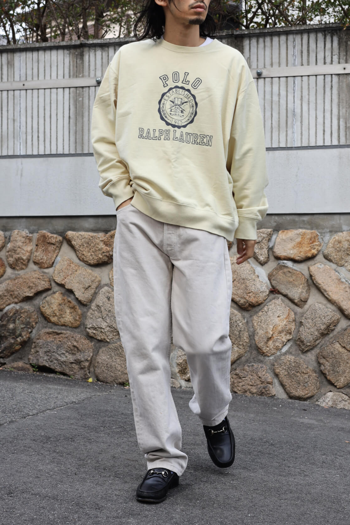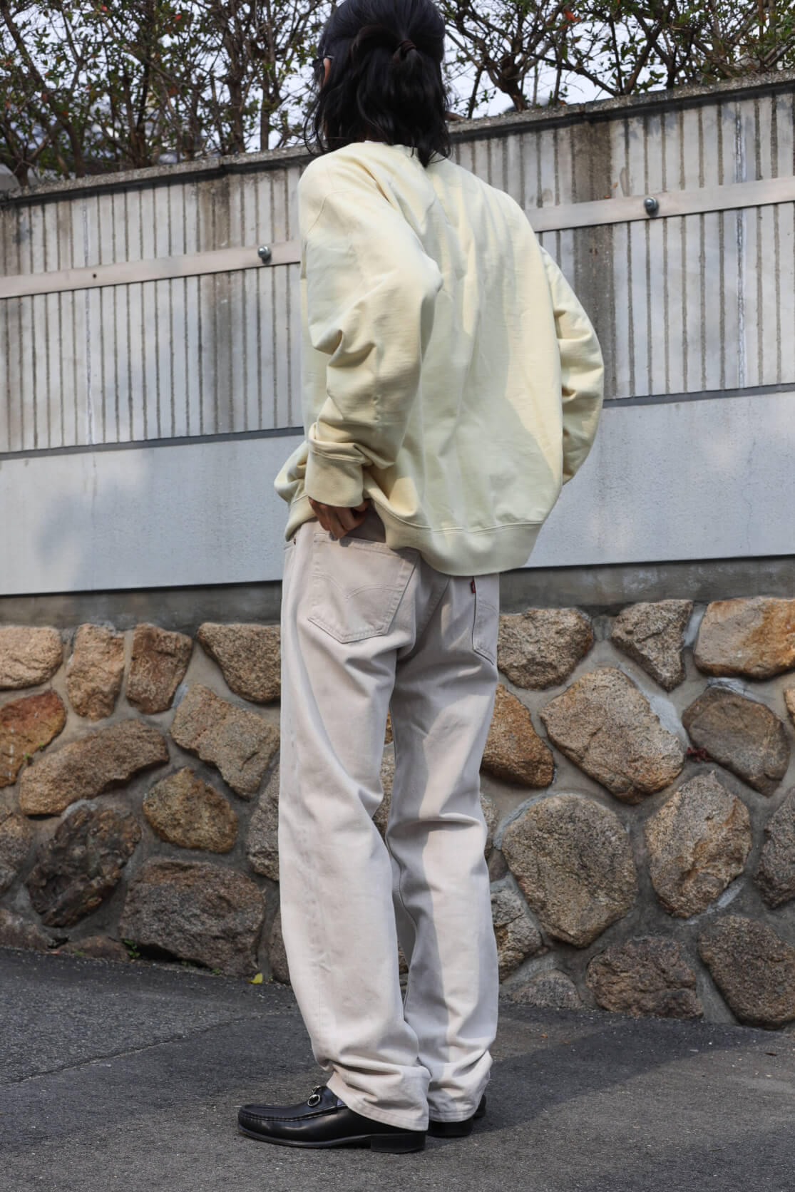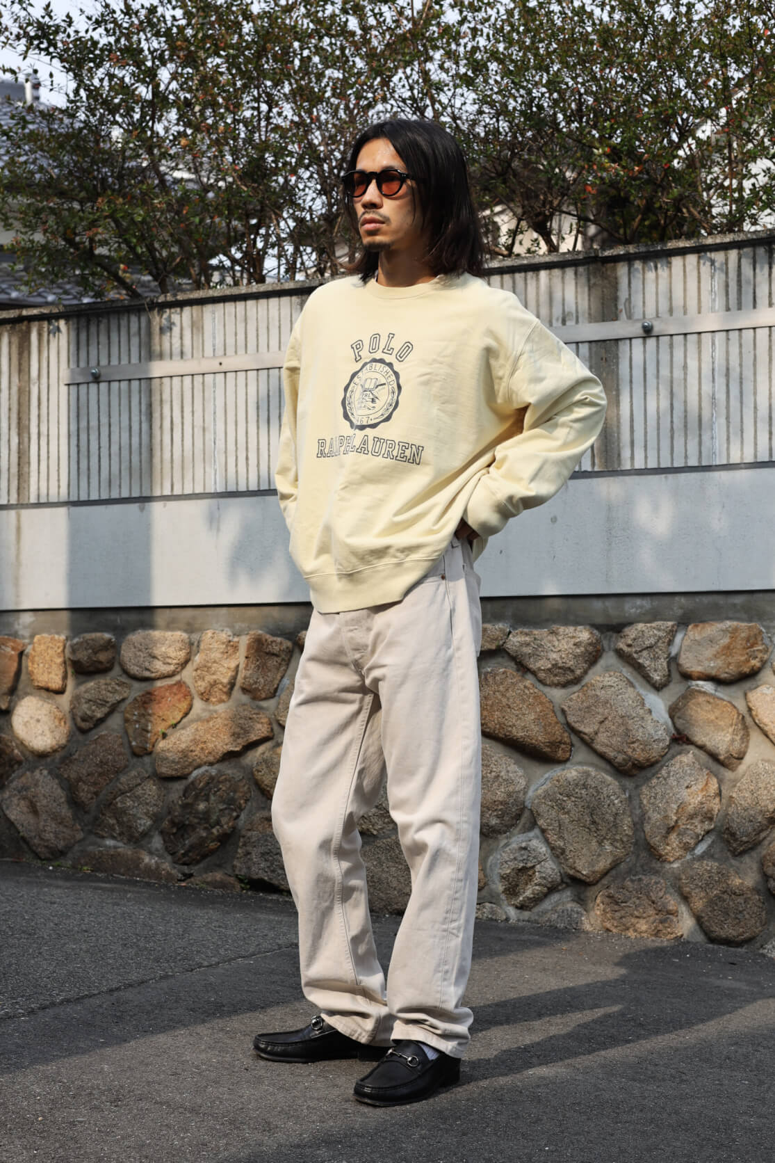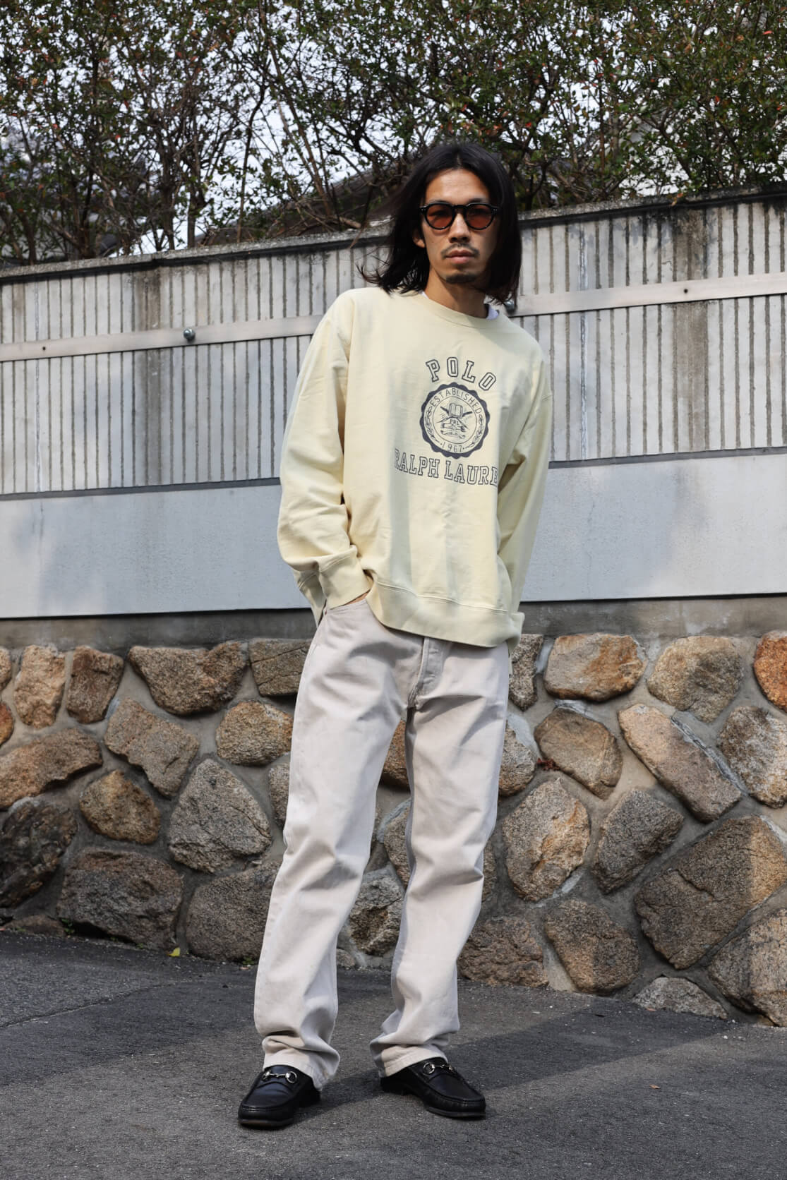 今回は、ラルフローレンのヴィンテージ・スウェットに、エクリュカラーの501を合わせたスタイリング。