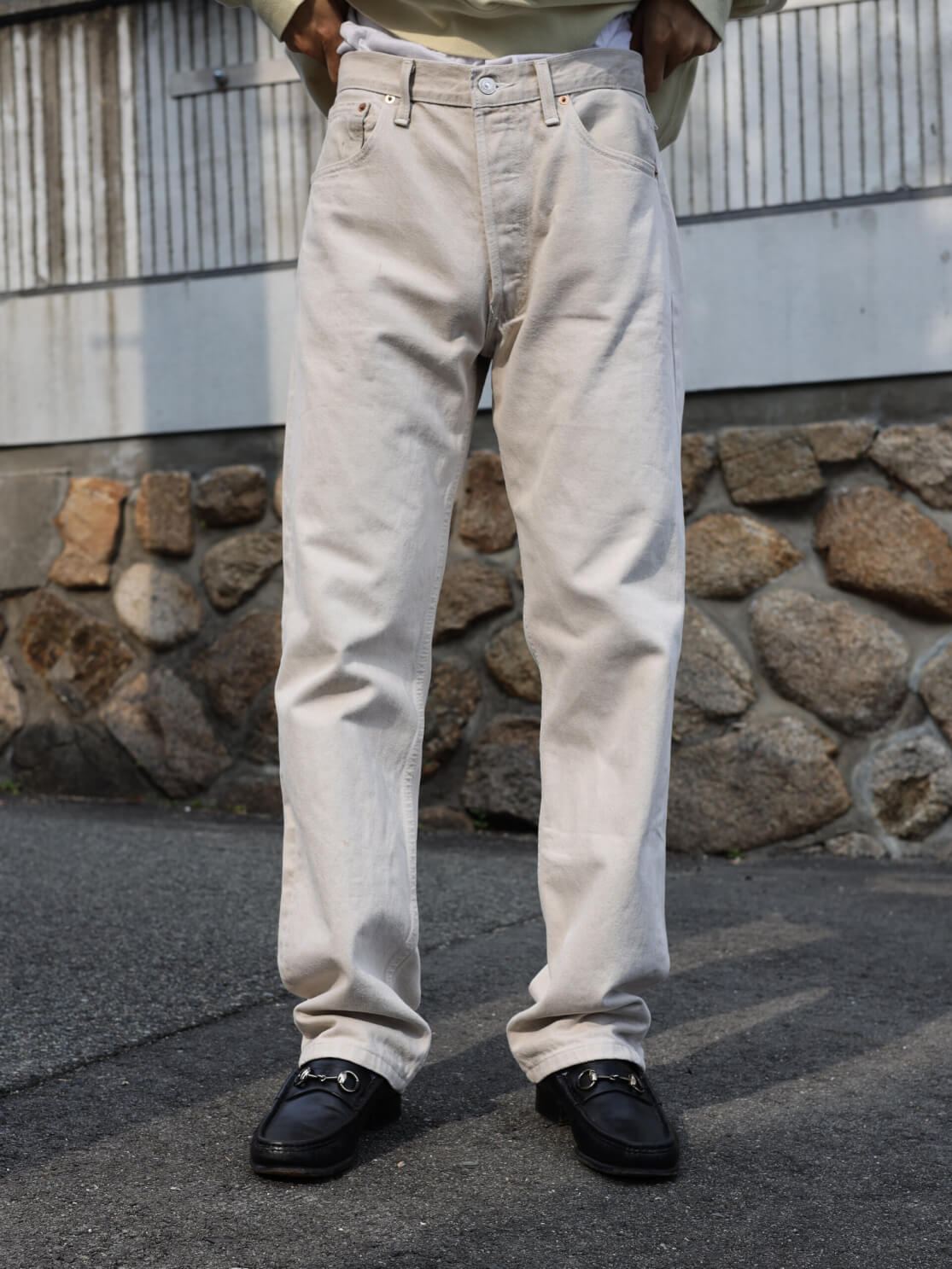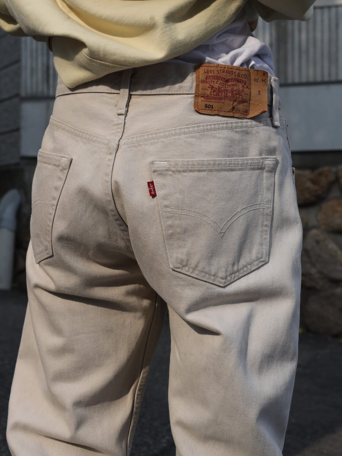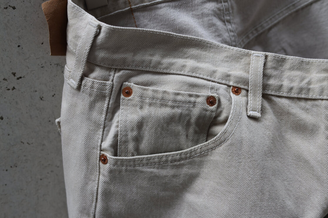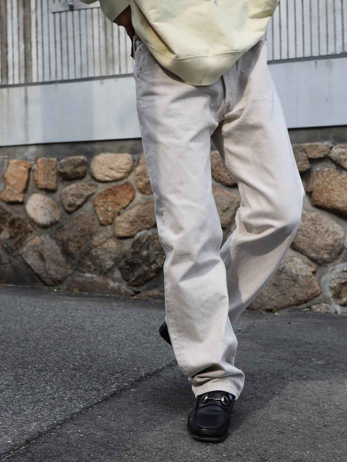 今回レビューするのは、2000年代初頭のの古着のユーロリーバイス501。カラーは希少なエクリュで、古着らしい表情のある一本です。