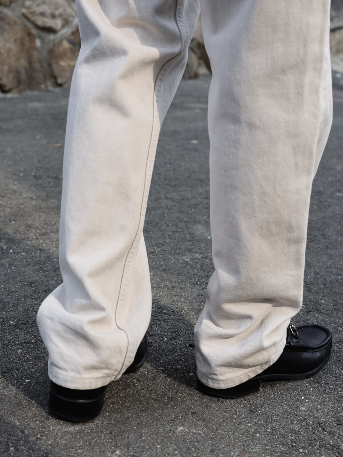 現行品との最大の決定打は、やはり「色と表情」にあります。たとえば、今回着用している「生成り(アイボリー/エクリュ)」の色味は、現行のラインナップでは基本的に見かけません。新品だと「濃紺(インディゴ)」や「黒」といったハッキリした色味に振り切られがちですが、その中間にある曖昧で奥深いカラーを狙えるのは、古着ならではの醍醐味です。