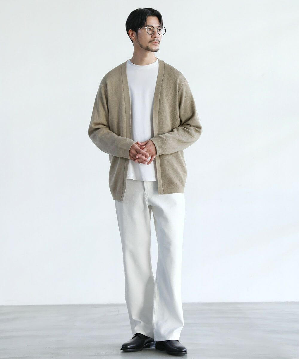この組み合わせは、シンプルで清潔感があり、程よいトレンド感も備わった好印象なスタイル。特に首元から覗く白Tシャツが抜け感を演出していて、重すぎず爽やかに見えます。ややキレイめ寄りなので、足元はスニーカーでハズすのがおすすめ。女子ウケも狙える万能コーデです。
