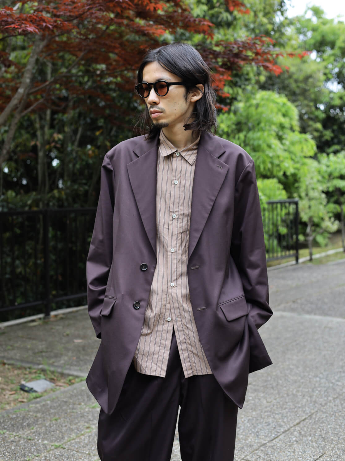 ナイスネスのテーラードジャケットとスラックス、クリスタセヤのストライプシャツ、ユニクロのサングラスのメンズコーデ