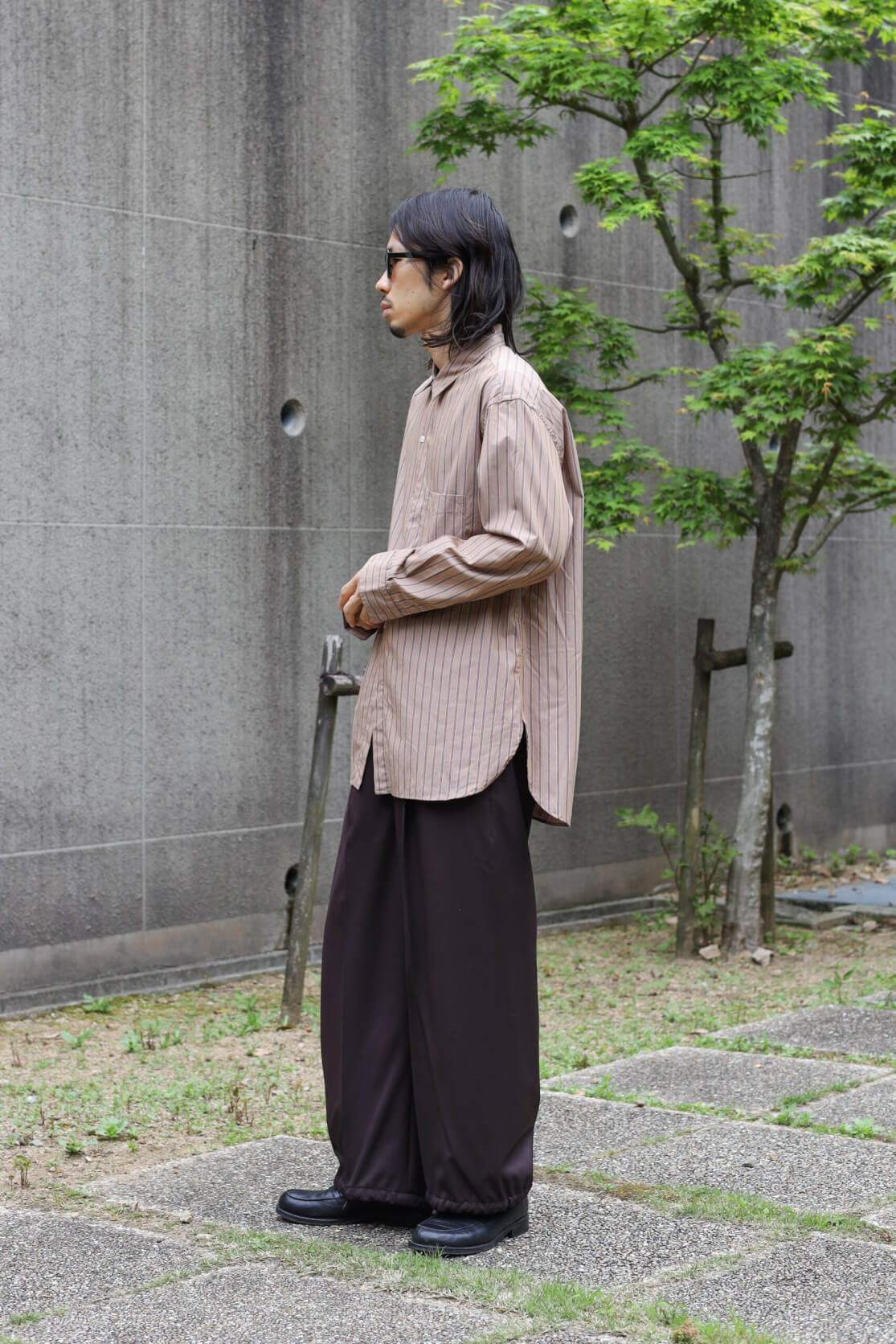 グレージュのストライプシャツに、黒のワイドスラックスとチロリアンシューズを合わせたスタイル。上が明るく、下が暗い配色にすることで、自然と脚が長く見えます。
