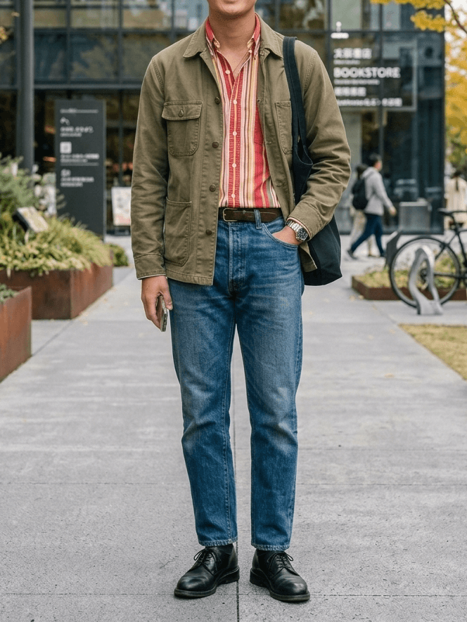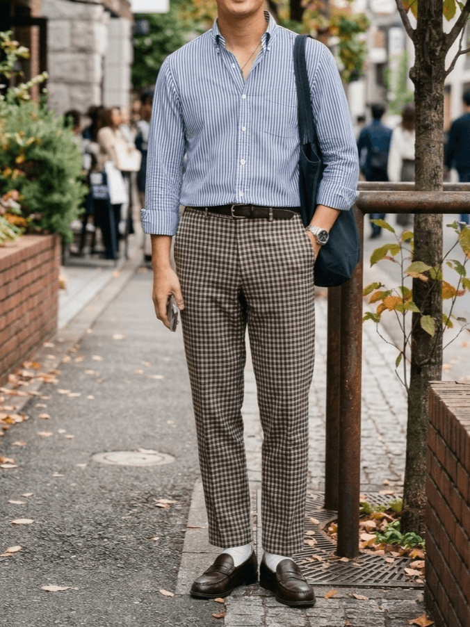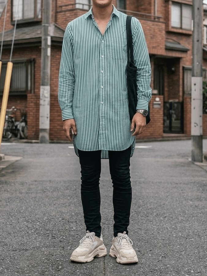たとえば、「ストライプシャツ × スラックス × 革靴」。もちろん間違いではないですが、組み方によっては「真面目すぎる」「遊びがない」と感じられることもあります。
