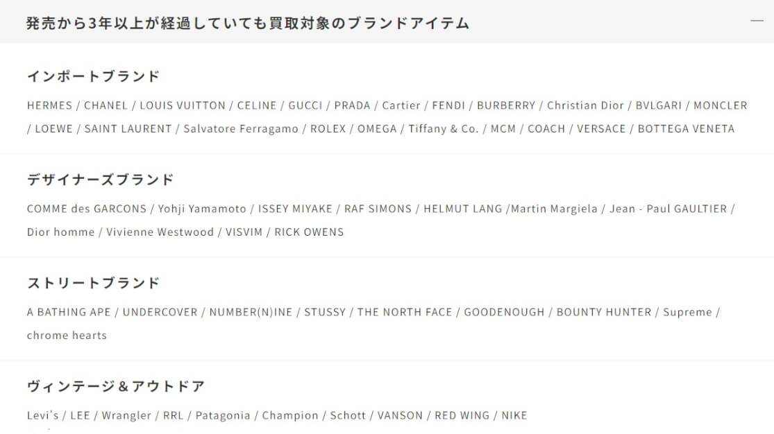 公式サイトには「発売から3年以上経過したアイテムは原則買取不可」と記載されていますが、実際にはブランドやデザインによっては買取対象になることもあります。